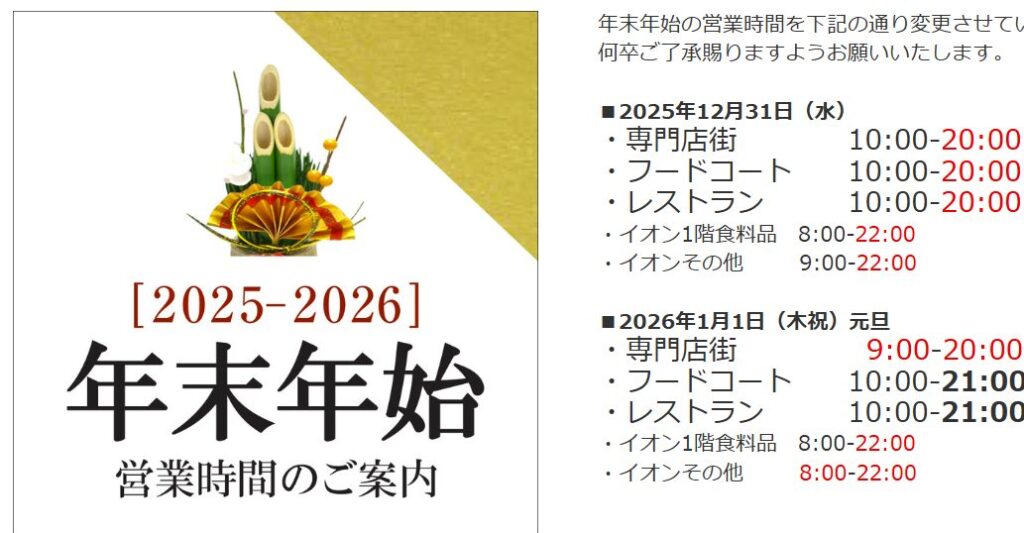 イオンモール久御山の情報を見ると、12月31日は専門店街として10:00〜20:00の営業となっていました。
