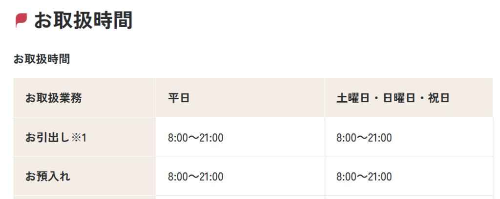 まず基本として、お引き出し・お預け入れ・通帳記入などは、平日・土日祝を問わず、基本的には8:00〜21:00まで利用可能です。