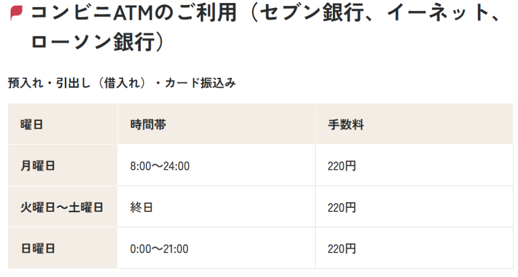 コンビニATMを利用する場合、基本的にはどの時間帯でも220円の手数料が発生します。
