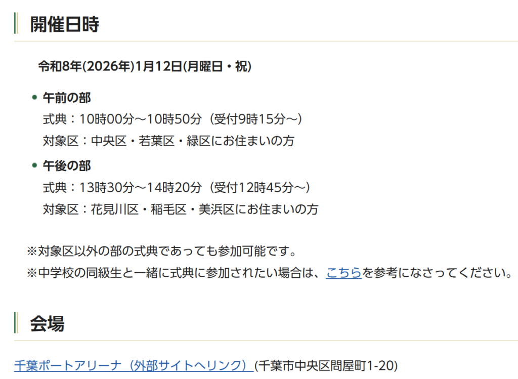 千葉市こども未来局の二十歳のつどいページには、開催日、会場、アクセス方法などが詳しく載っています。