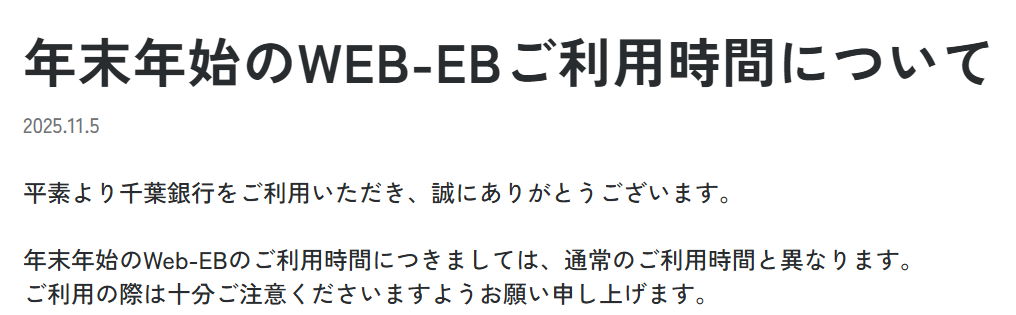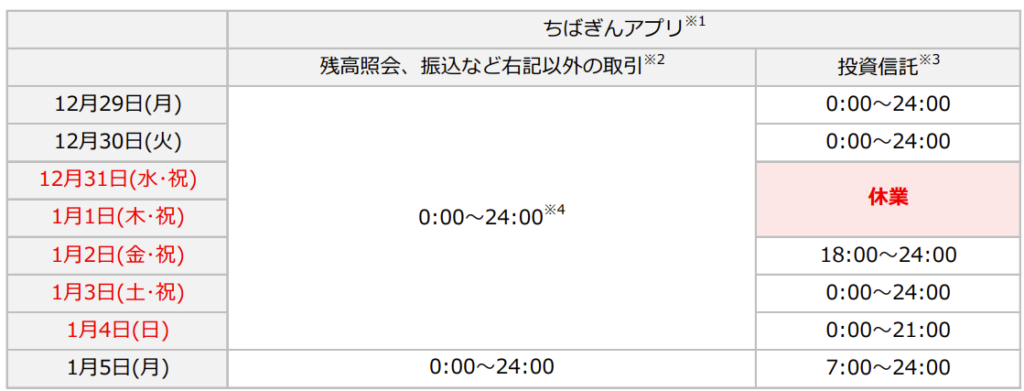 千葉銀行の公式発表によると、年末年始のインターネットバンキング利用時間はこんな感じです。