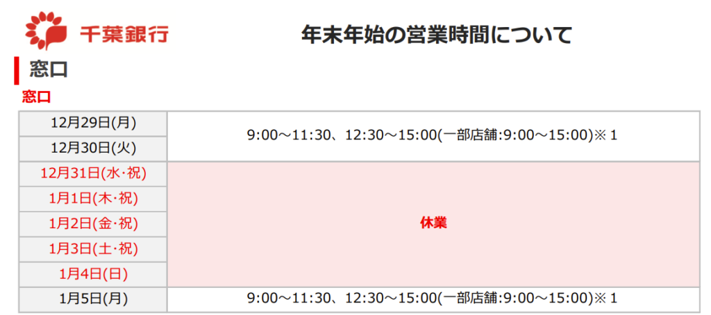 千葉銀行年末年始2025-2026における窓口の年内最終営業日と営業開始日は?