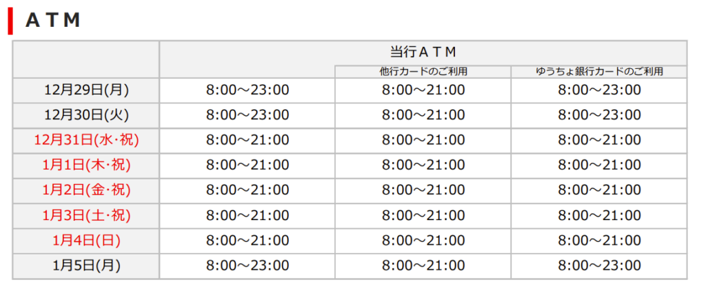 3. ATMは年末年始も動いてるけど、祝日扱いで手数料がかかる