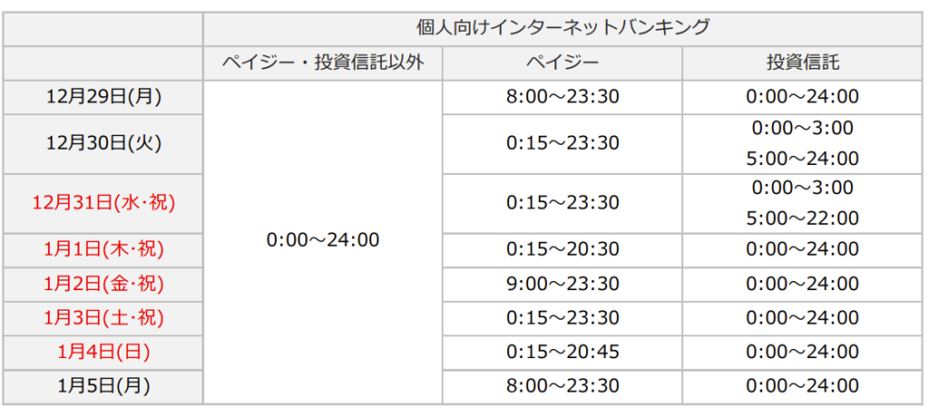 この表を見てもらうとわかるんですが、特に要注意なのが1月1日から1月3日のインターネットバンキング