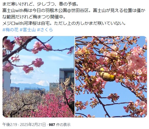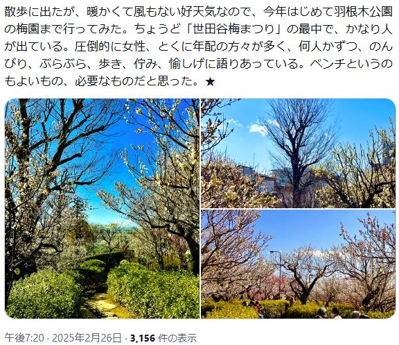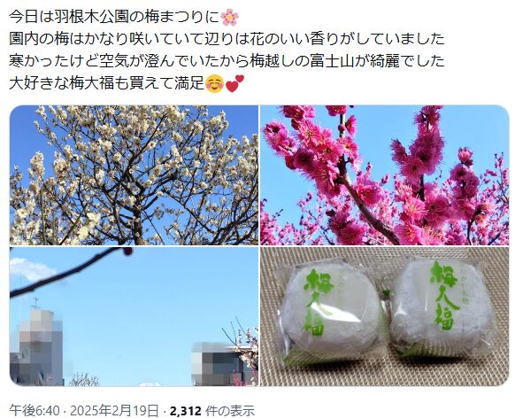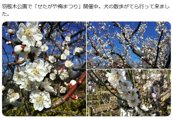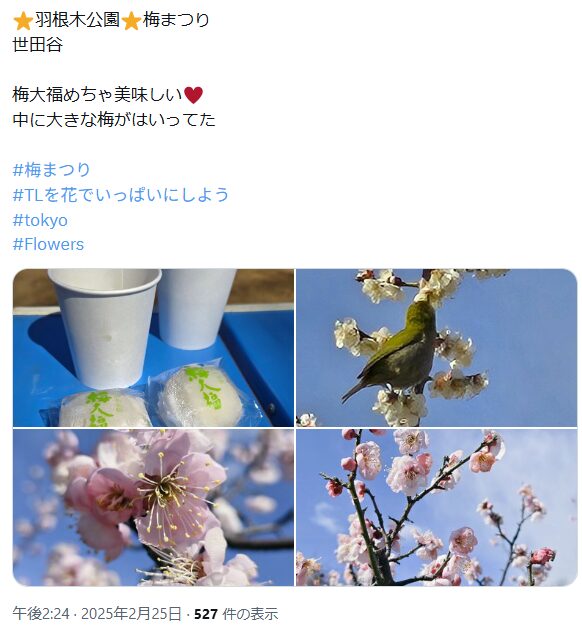 TwitterやInstagramで「#せたがや梅まつり」「#羽根木公園」と検索してみてください。実際に訪れている方々の投稿がリアルタイムで見られます。