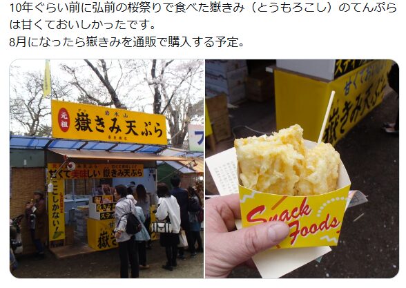 そんなプレミアムな嶽きみを天ぷらにした屋台グルメが、弘前さくらまつりの人気メニューの一つになってるんです。
