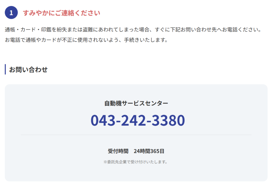 でも京葉銀行の場合、紛失・盗難時は必ず電話での連絡が必要です。