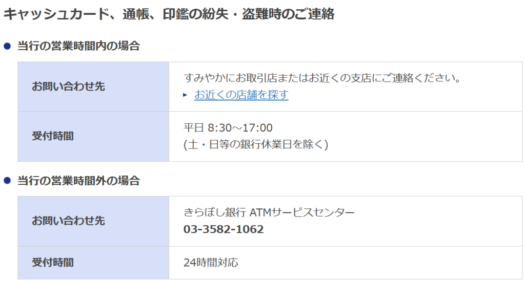 きらぼし銀行では、キャッシュカードや通帳の紛失・盗難に対応する専用窓口を設置してます。