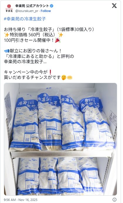幸楽苑では、冷凍生餃子(1袋標準30個入り)のテイクアウト販売をしています。