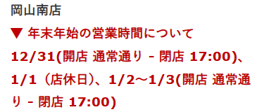 具体的に見てみると、札幌東雁来店や岡山南店といった直営店では12月31日の開店時間はいつも通りで、閉店時間が17時と案内されていました。