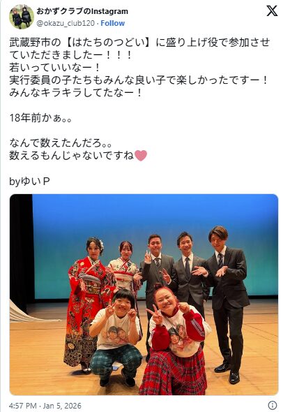 おかずクラブの公式Instagramに、「武蔵野市の【はたちのつどい】に盛り上げ役で参加させていただきましたー!!!若いっていいなー!実行委員の子たちもみんな良い子で楽しかったですー!」って投稿されてて、読んでるこっちまで楽しい気分になりました。