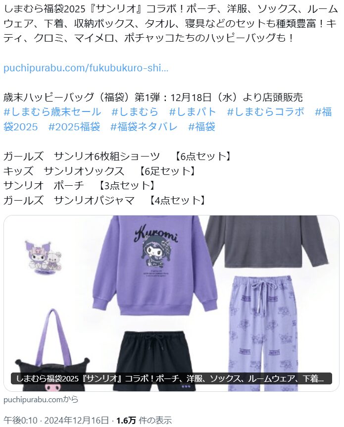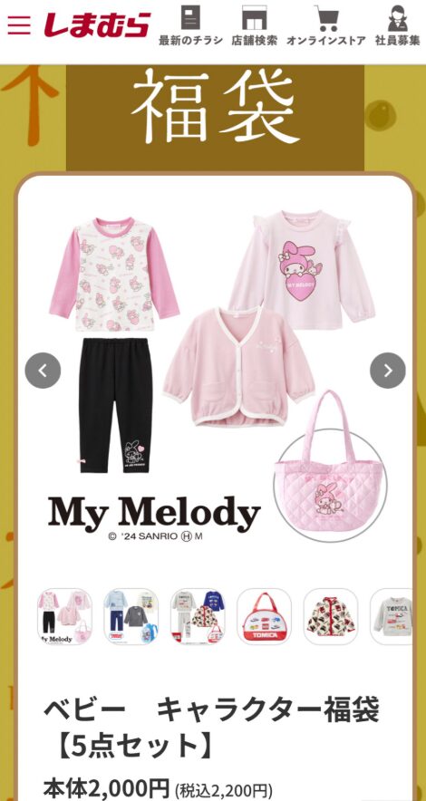 しまむらって、毎年サンリオキャラクターの福袋を結構力を入れて販売しているんです。