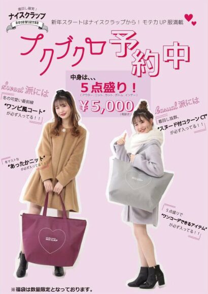 すでに予約販売が始まっていますが、ナイスクラップの福袋は毎年本当に大人気ですぐに完売してしまうので、見つけたら早めにチェックするのがおすすめですよ。