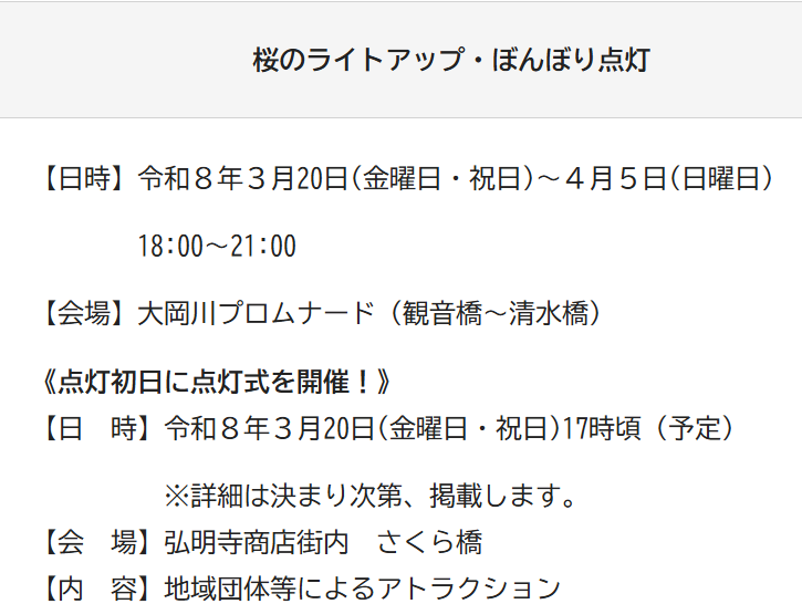 2026年の大岡川(弘明寺)桜祭りは、3月20日(金・祝日)から4月5日(日)まで開催される予定です。