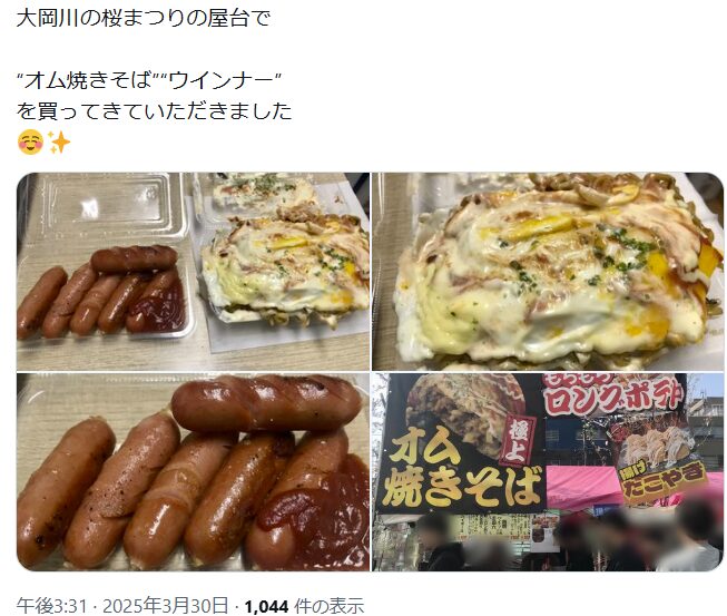 私の肌感覚だと、満開ピークの週末は屋台の種類もバリエーションも一気に豊富になるので、その時期を狙って足を運ぶのが正解かなと思います。
