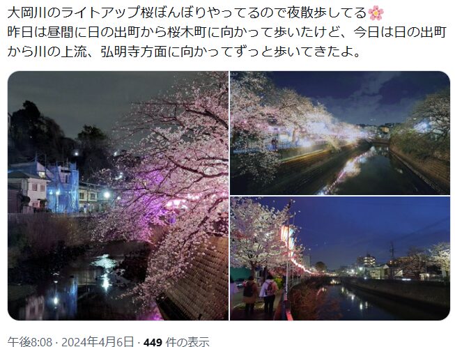 昼間の桜も十分に美しくて、川面にキラキラ映る桜の姿は昼ならではの魅力があります。