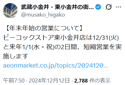 毎年、ピーコックストア(イオンマーケット)での買い出しに奔走してきた私の経験から、2025年年末~2026年年始の営業時間を予想してみました。