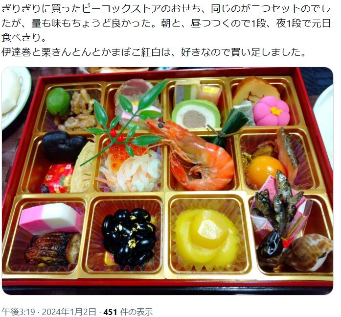 私は数年前に「頑張らないお正月」を決意して以来、ピーコックストアのおせちに頼りっぱなしです。