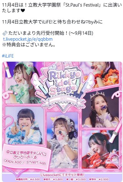 - iLiFE!(アイドルグループ):アイドル企画「Rikkyo Idol Stage」でキュートなステージを見せてくれます(11月4日)