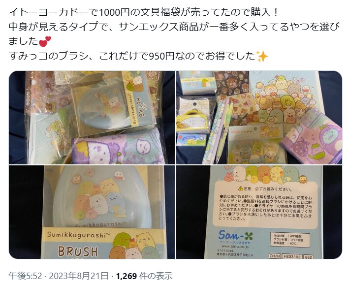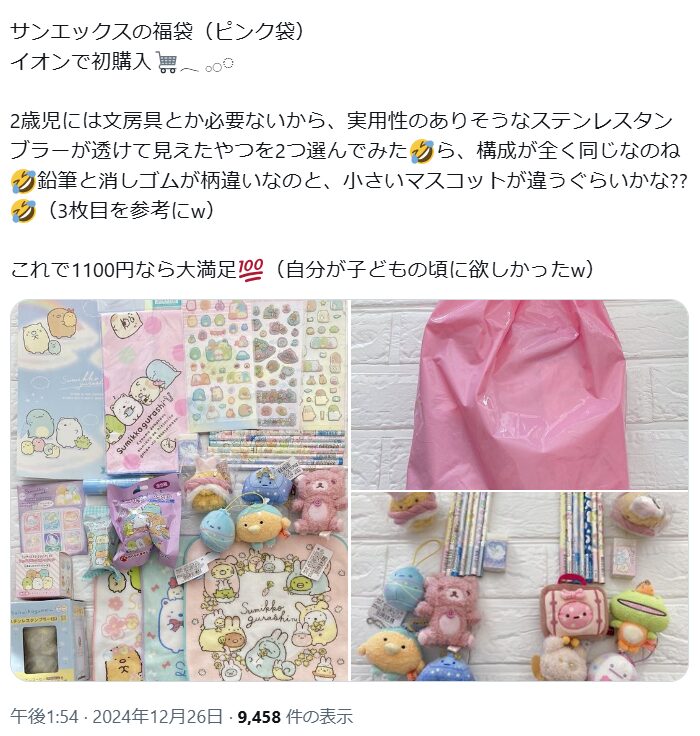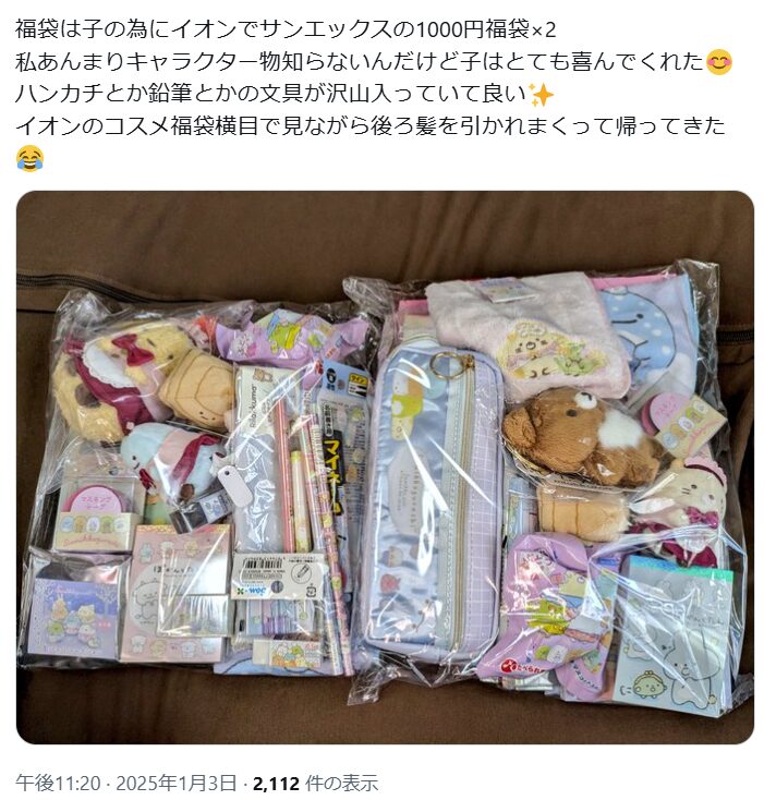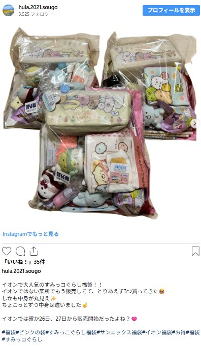 以前、イオンモール内の雑貨屋さんで「すみっコぐらし福袋」が販売されて、SNSでめちゃくちゃ話題になってました。