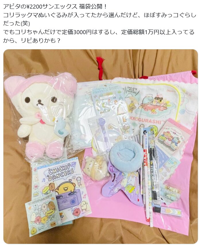 ほかにも、アピタで購入したサンエックスの福袋に、コリラックマのかわいいぬいぐるみが入っていたという情報も!