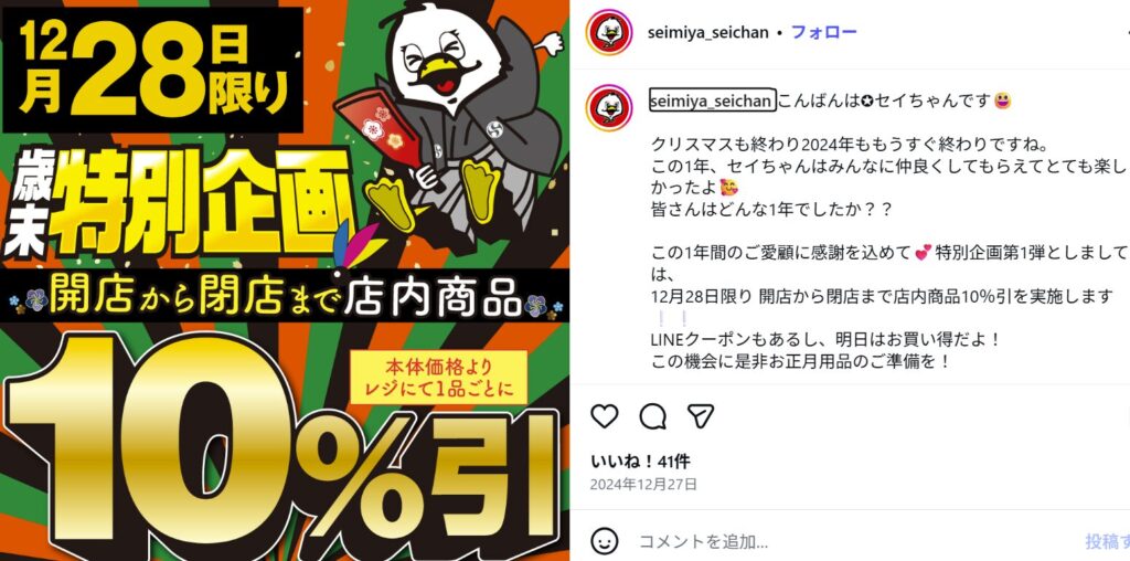 2024年には、12月28日限定で店内商品10%引きの歳末特別企画が行われました↓