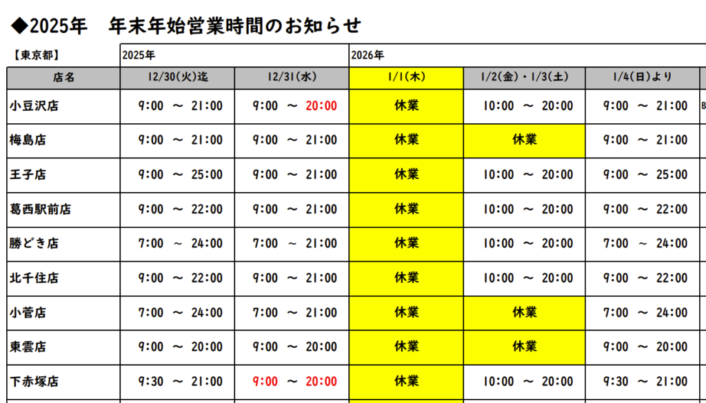 2025年から2026年にかけての東武ストアは、いつもと違う特別スケジュールになる、と考えておきましょう。