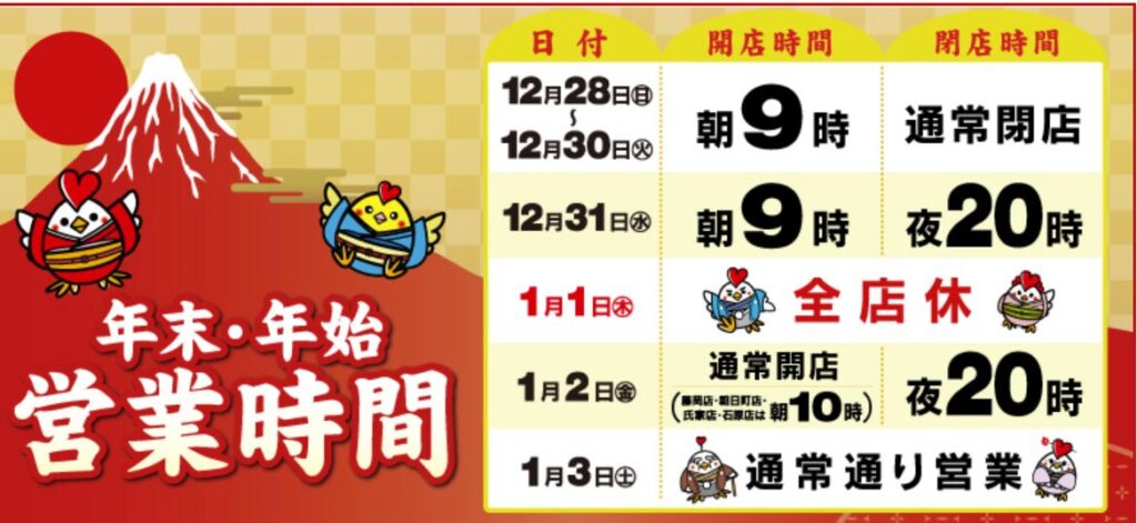 特に、普段から朝10時開店の4店舗(朝日町店、石原店、藤岡店、氏家店)は、1月2日の初売りも10時開店となっています。