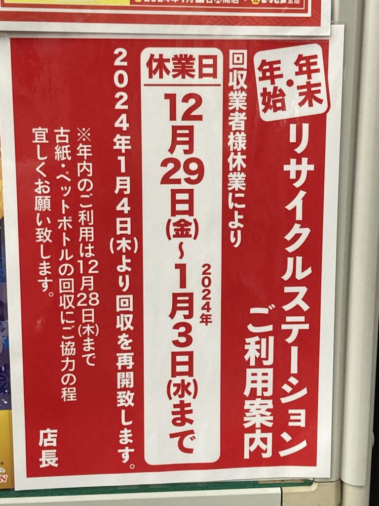 年末年始のリサイクルステーション稼働状況については、店舗に直接問い合わせるか、公式サイトでの発表を待つのが確実だと思います。
