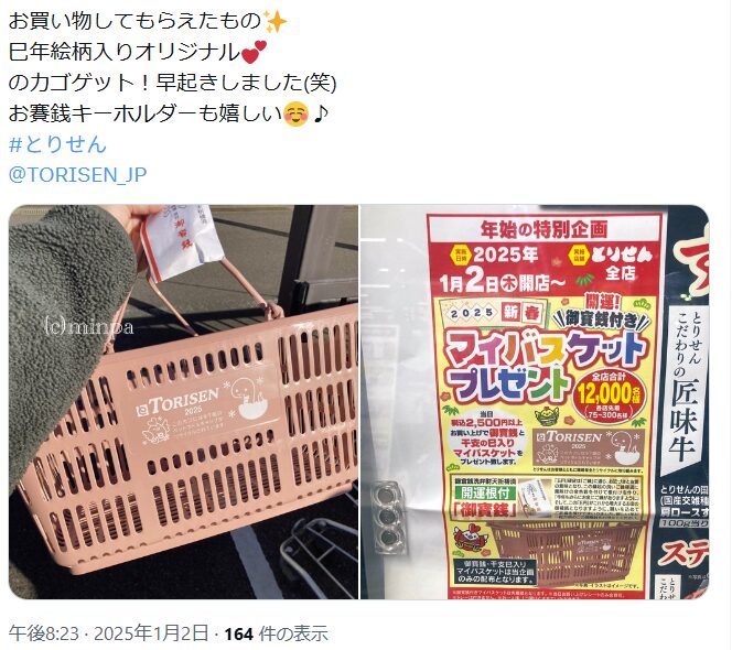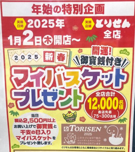 過去2年間(2023年、2025年)は、2500円以上お買い上げの先着のお客様に「開運お賽銭付きマイバスケット」のプレゼントがありました。