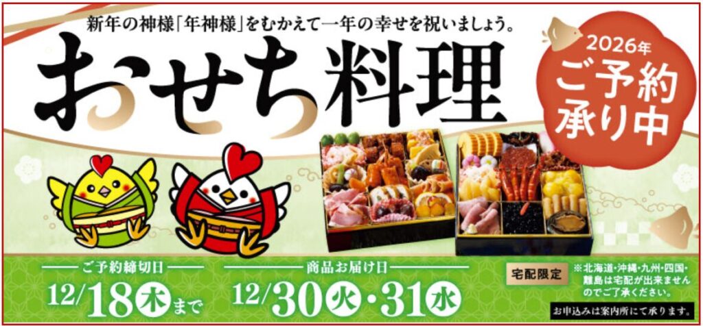 公式サイトには「2026おせち料理ご予約承り中!」という案内が出ていますね。