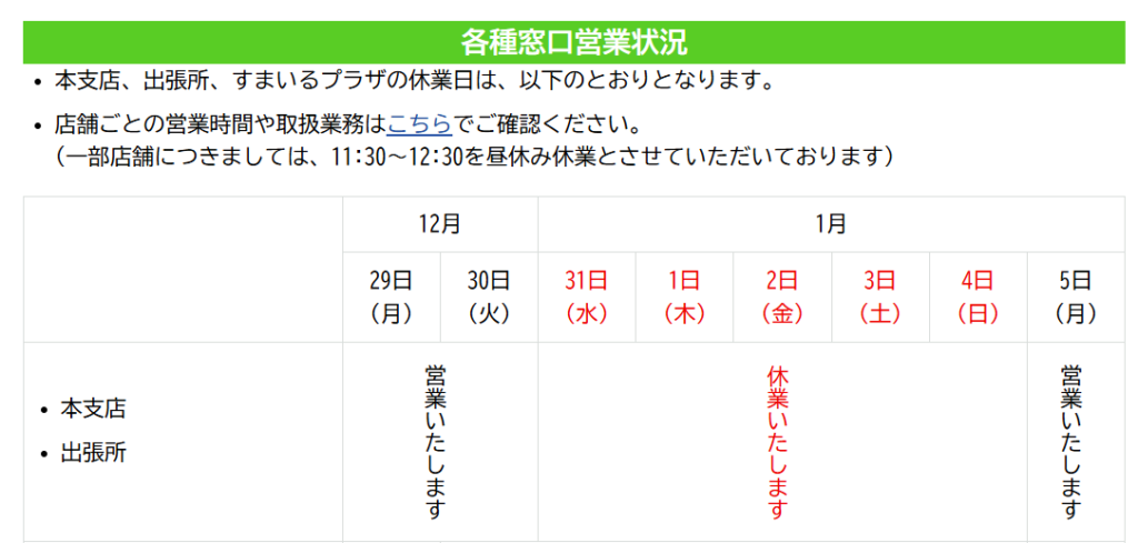 - 窓口の休業: 本支店は12月31日〜1月4日、すまいるプラザは12月30日〜1月4日