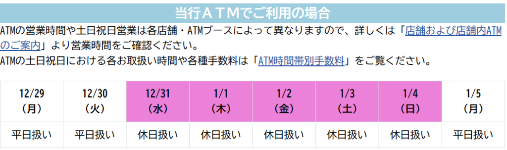 - ATMは休日扱いで稼働: 手数料と利用時間に注意