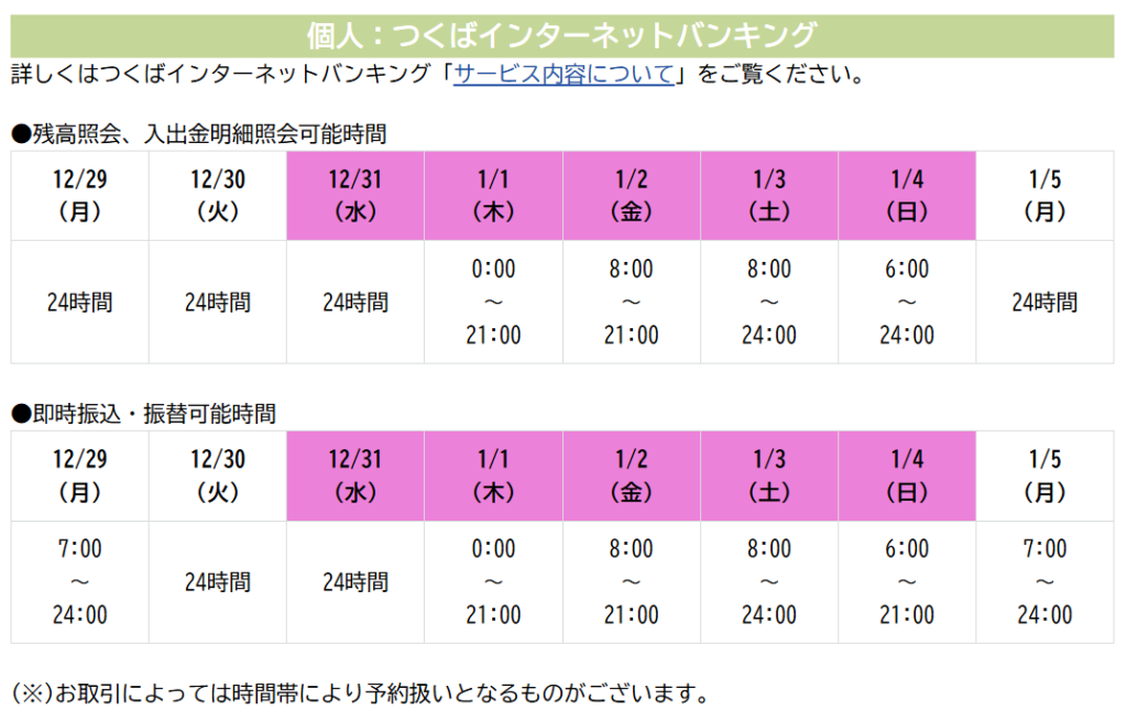 - 残高照会・入出金明細: 12月31日は24時間、1月1日〜4日は夜間を除いて利用可能