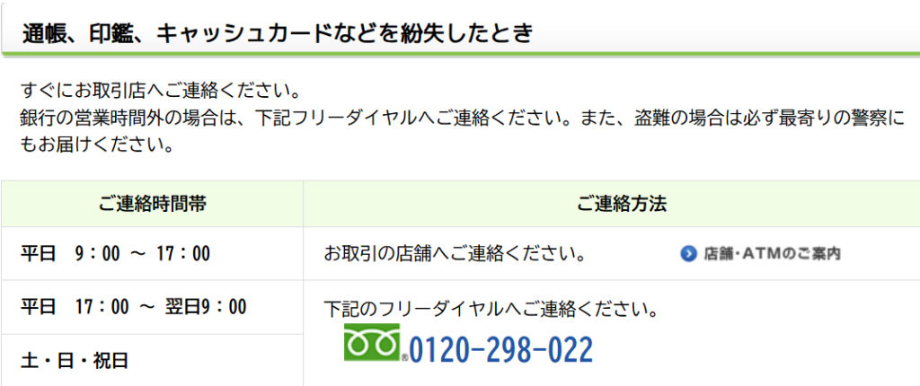 - 対応時間: 平日9:00〜17:00以外の時間帯も、ATMカード紛失・盗難については対応してくれます