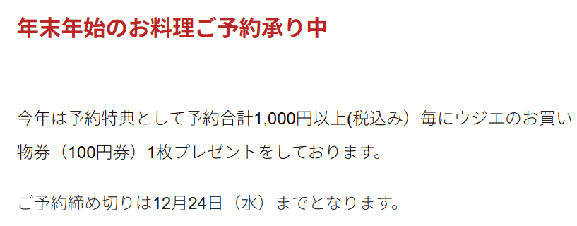 予約合計1,000円以上(税込)ごとに、ウジエのお買い物券(100円券)を1枚プレゼントしてくれるそうです!