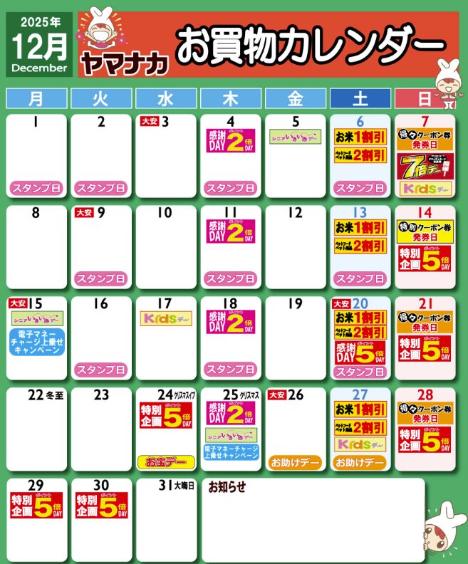 ヤマナカ年末年始2025-2026の営業日・休業日はいつ?
